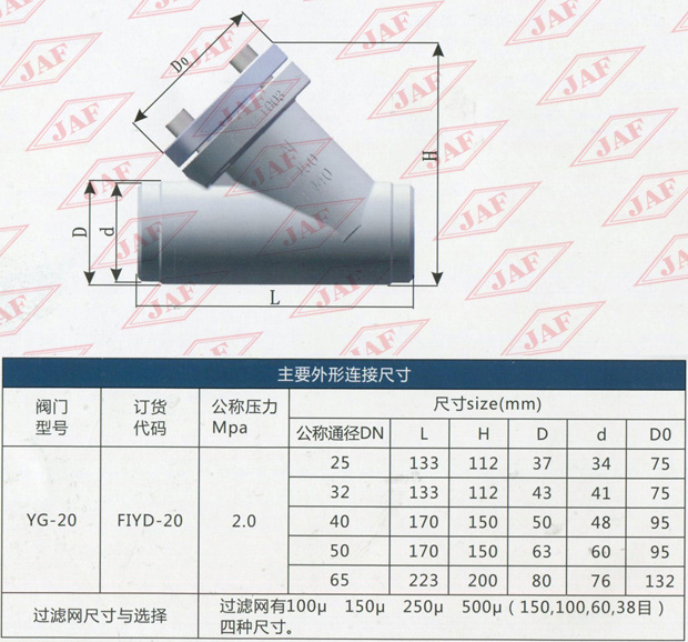 FI表示過濾器 Y表示結(jié)構(gòu)形式為直流式 D表示對焊連接 20代表公稱壓力為2.OMPa 20后不標注表示殼體材質(zhì)為鍛鋼。
